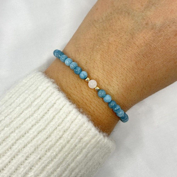 Delikatna bransoletka na elastycznej gumce, wykonana ręcznie z naturalnych kamieni: akwamarynu i kryształu górskiego. To połączenie harmonii, odwagi i czystości energii – idealne dla osób, które pragną spokoju, jasności myśli i wewnętrznej równowagi.