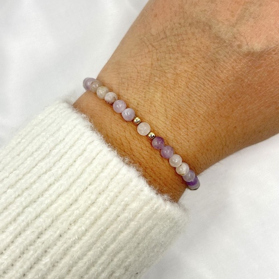 Delikatna bransoletka na elastycznej gumce, wykonana ręcznie z naturalnych kamieni: jadeitu lawendowego i kryształu górskiego. To połączenie spokoju, harmonii i czystej energii – idealne dla osób, które pragną wewnętrznego wyciszenia, równowagi emocjonalnej i jasności myśli.